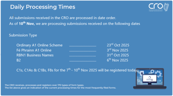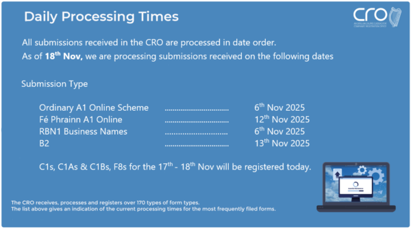 While the CRO endeavours to process all applications as quickly as possible, in order to give your applications the best chance of being registered prior to the Christmas break, we suggest that you submit applications no later than the following dates: