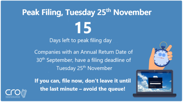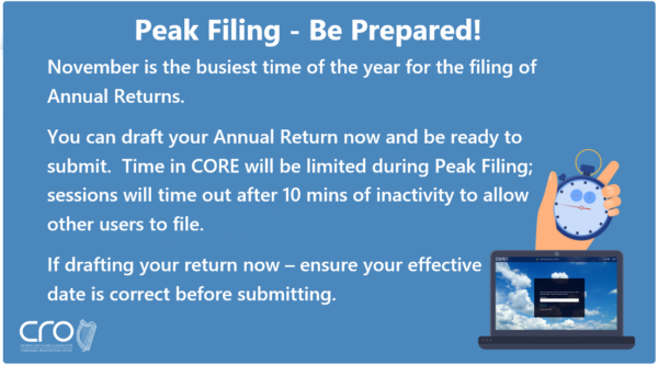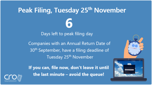 There are four days left in the Peak Filing period for the CRO. During the month of November up until the 25th of November, over fifty thousand Annual Returns are typically submitted through CORE.