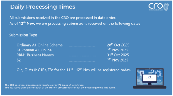 With effect from Wednesday 30th of July 2025 where a submission to the CRO has been presented by a presenter rather than the company itself, an email confirmation of receipt of the submission will be sent to the relevant company, for information, as well as to the presenter.