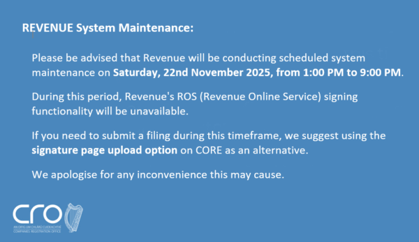 During this period, Revenue’s ROS (Revenue Online Service) signing functionality will be unavailable.