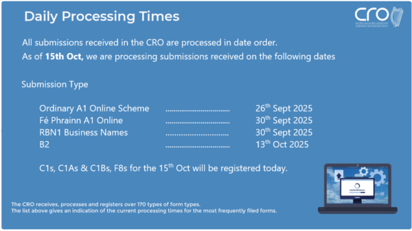 With effect from Wednesday 30th of July 2025 where a submission to the CRO has been presented by a presenter rather than the company itself, an email confirmation of receipt of the submission will be sent to the relevant company, for information, as well as to the presenter.