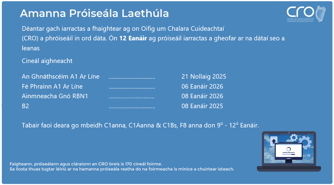 Déantar gach aighneacht a fhaightear sa CRO a phróiseáil in ord dáta.