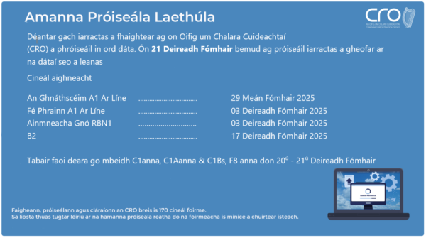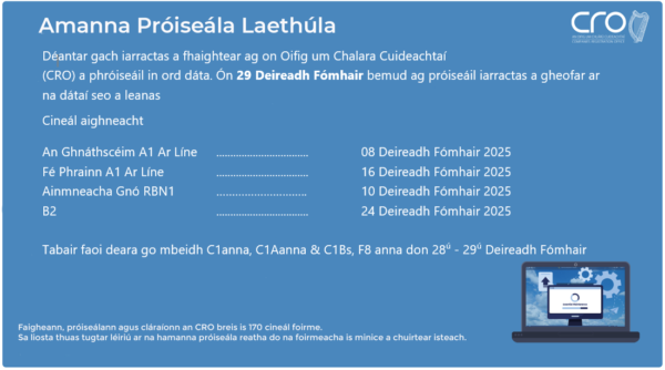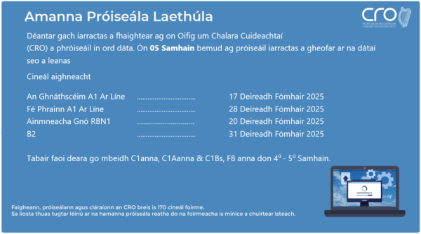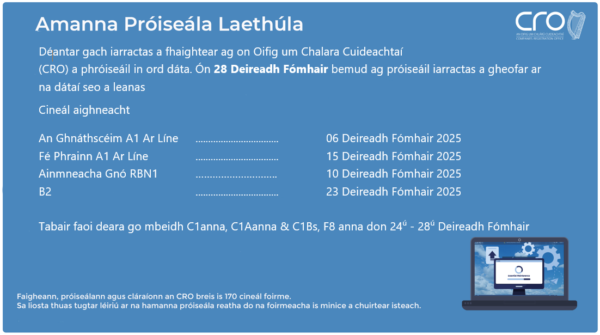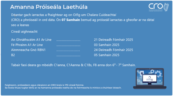 Tá cúig seachtaine oibre ann go dtí an 25 Samhain. Is í seo an tréimhse Comhdaithe Buaic don CRO, áit a gcuirtear os cionn caoga míle Tuairisceán Bliantúil isteach trí CORE i rith mhí na Samhna de ghnáth.